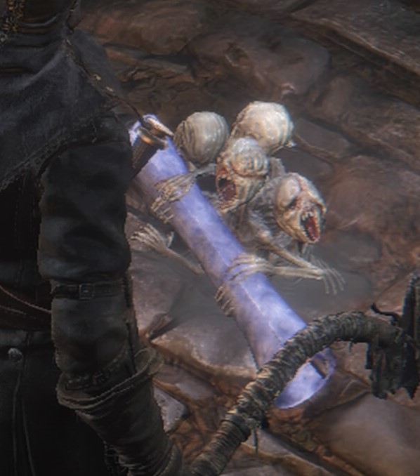 - 頭に被っている搭状の物体は上位者と交信するためのアンテナである。効果は不明。倒すとドロップして自分も被ることができる。