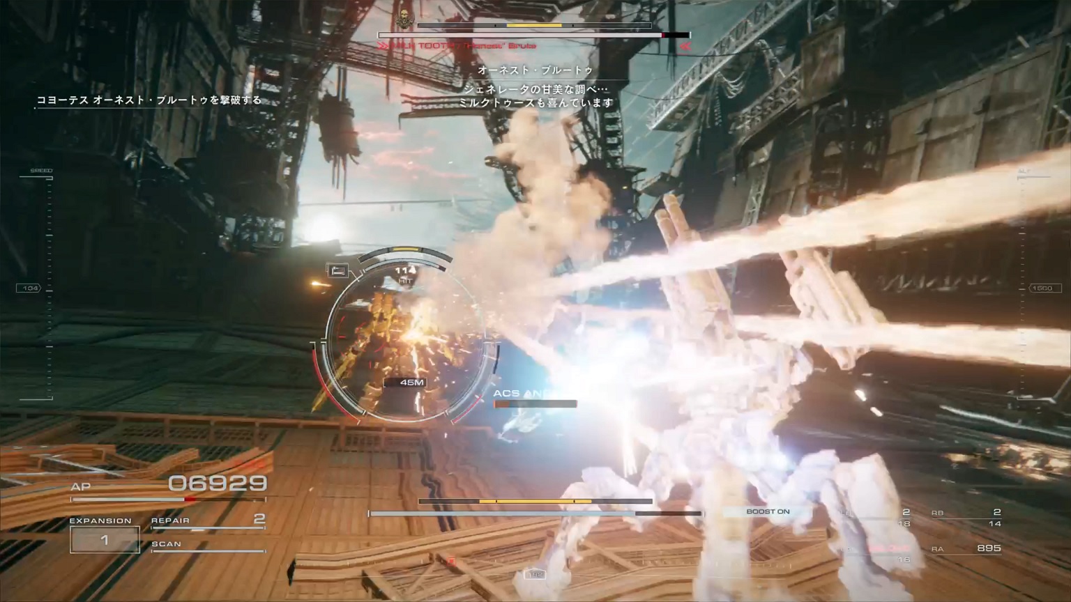 - 4機の無人ACを引き連れたボスACとまず1戦。まだ真っ当なAC戦。前座だけにリペアは使わない。