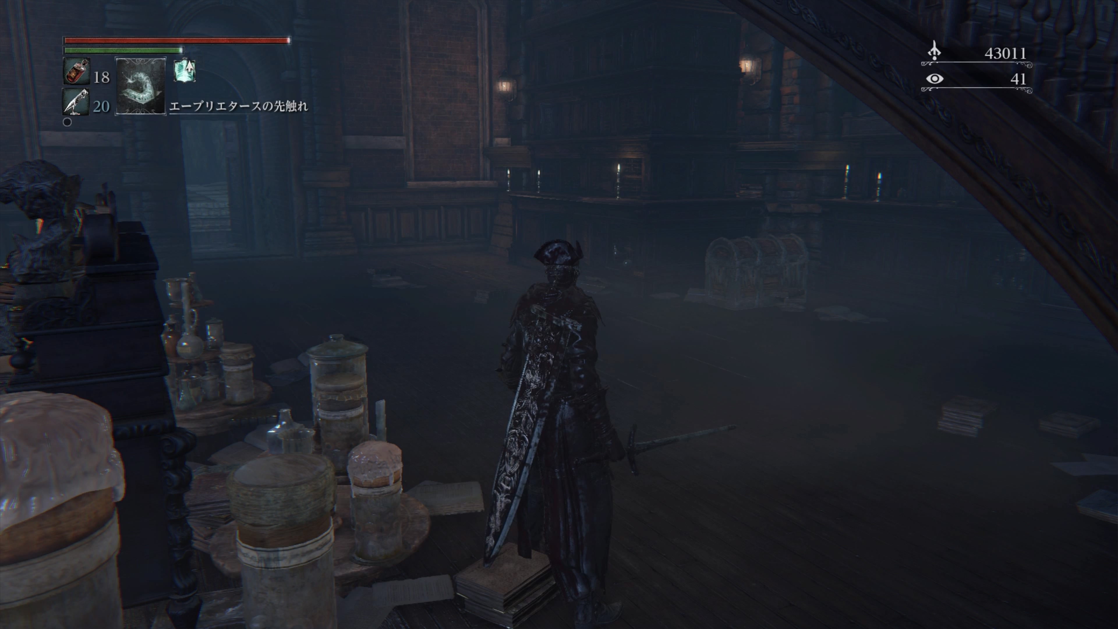 - 道中の脇道でアイテムの近くに1体脳喰らいがいる。後ろを向いているのでこっそり近付けば安全に始末可能。