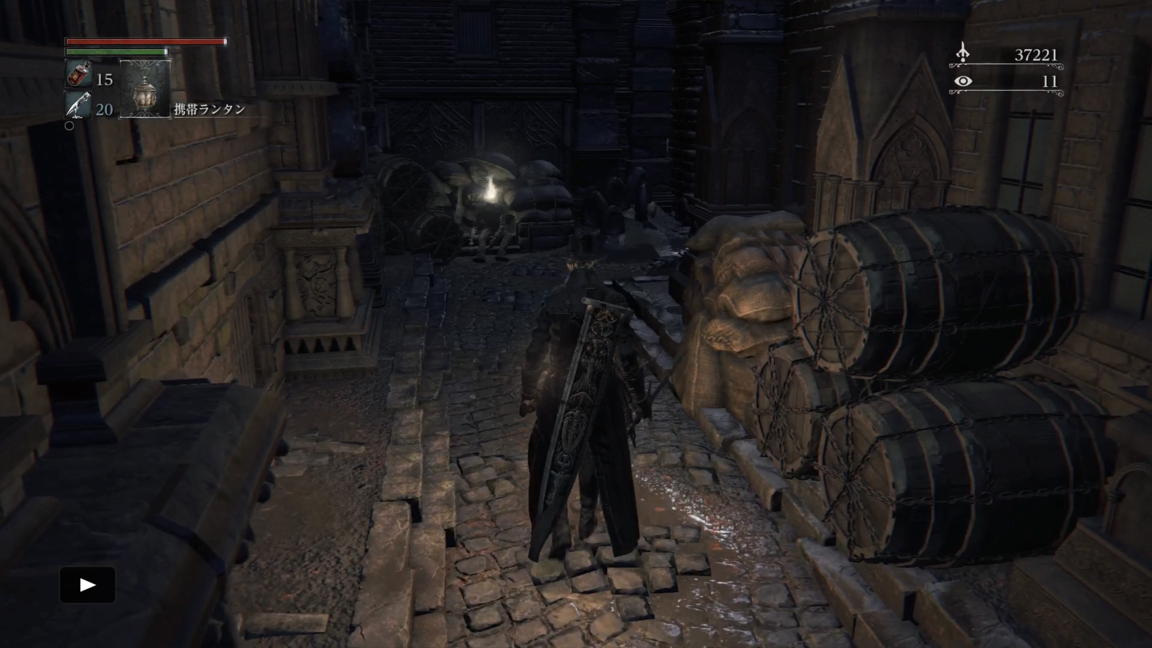 | 装束「ヤーナム市民一式」 | 通路左手奥、荷車に寄りかかっている遺体 |