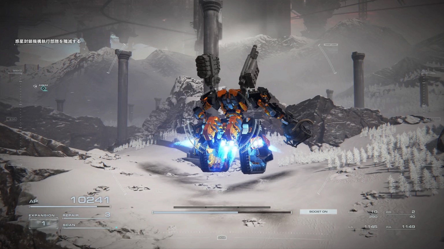 - 4機の無人ACを引き連れたボスACとまず1戦。まだ真っ当なAC戦。前座だけにリペアは使わない。