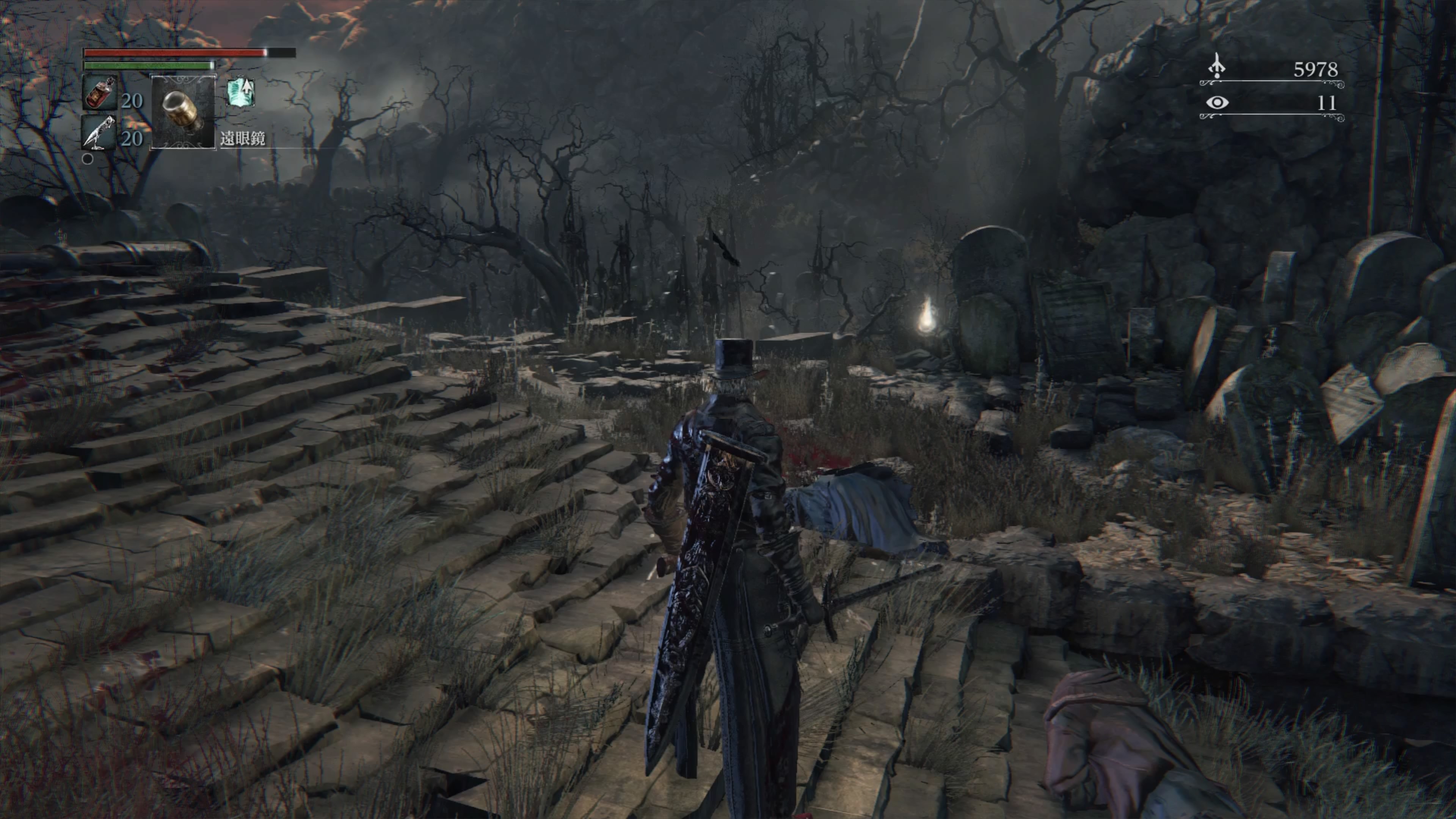 - まずは先に進む事になるが、階段を上って広場に上がると奥から焼き鏝の墓女と狩猟犬が降りて来る。また条件を満たしている場合、ここで狂気者が出現する。