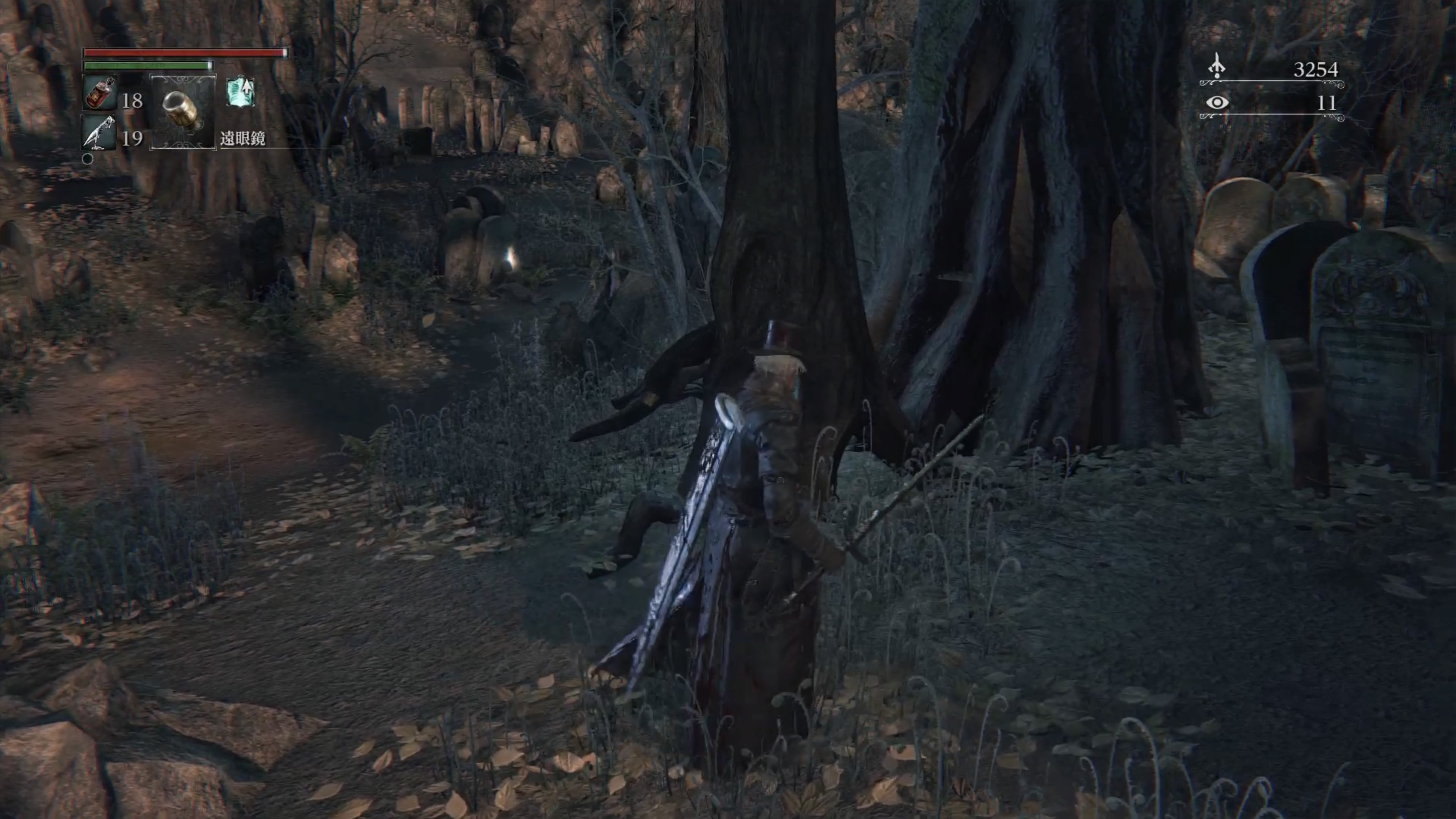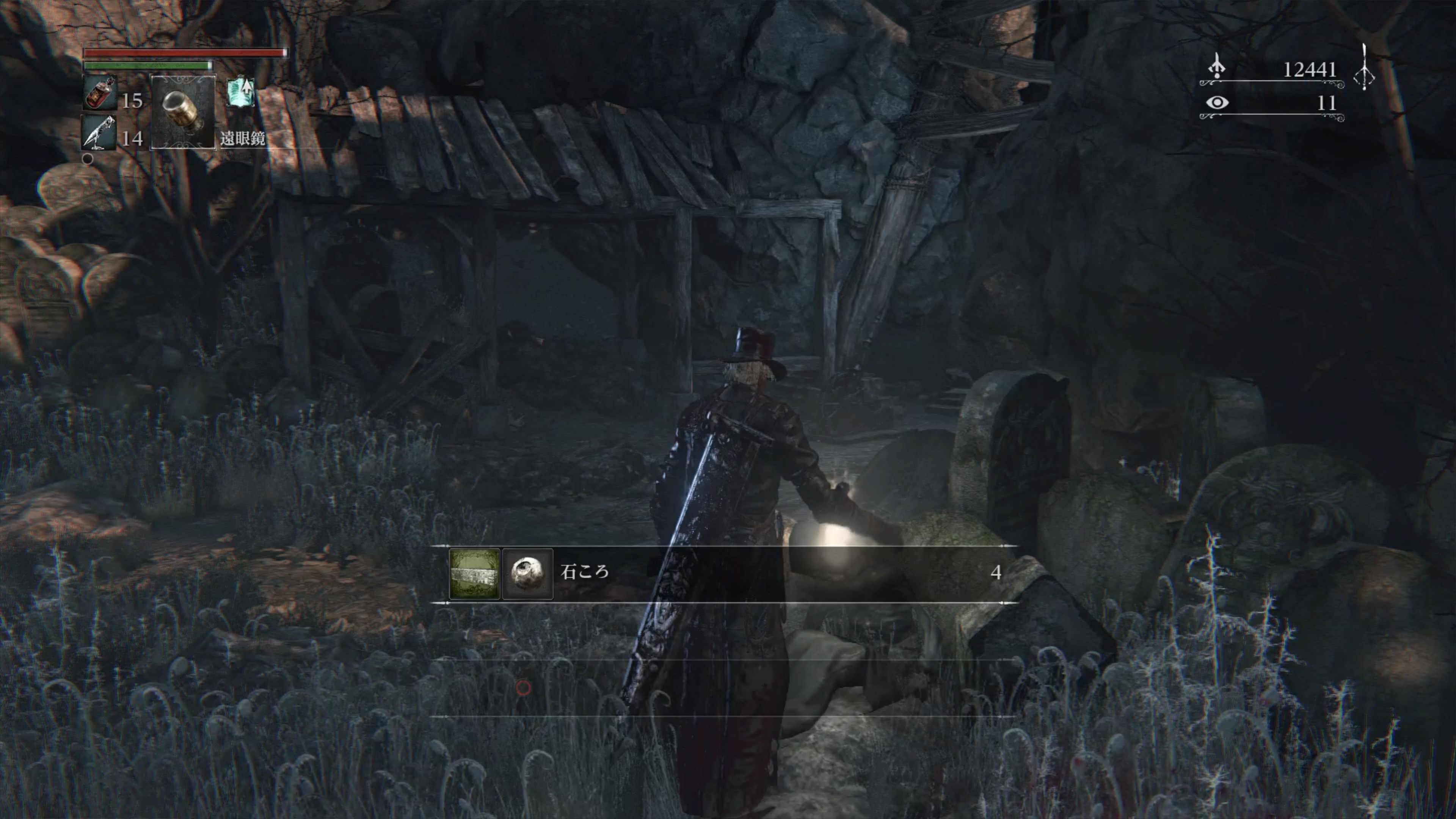 - 出口付近には更に1体の猟銃と2体の狩猟犬が居り、更に奥まで行くとドアがあり、その先がヘムウィックの墓地街である。まずは正面の灯りを点灯しよう。