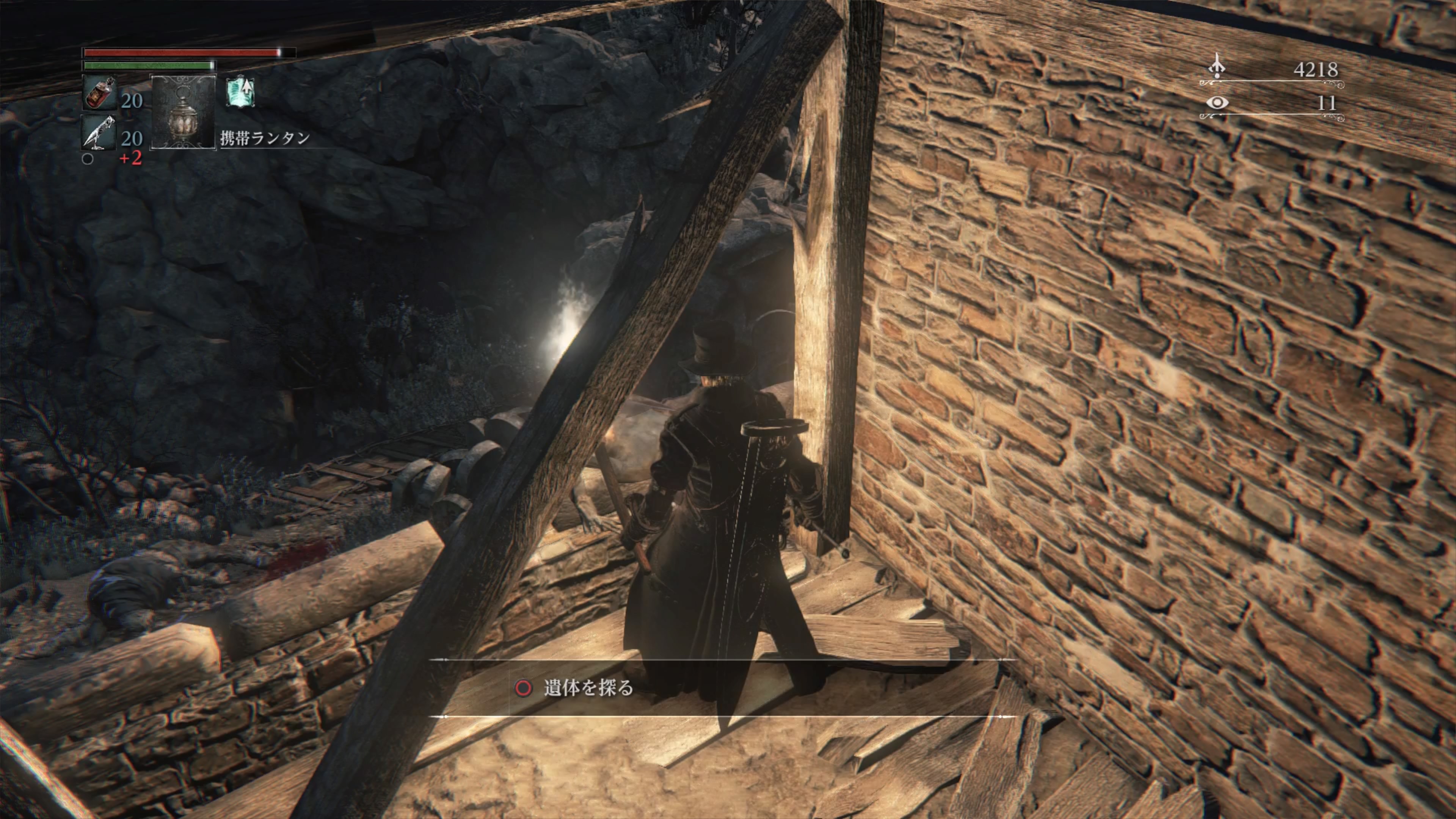 - 階段を降りると、目の前にはヤーナム市街で酷い目に遭わされた人もいるであろう解体人が2体もいる。