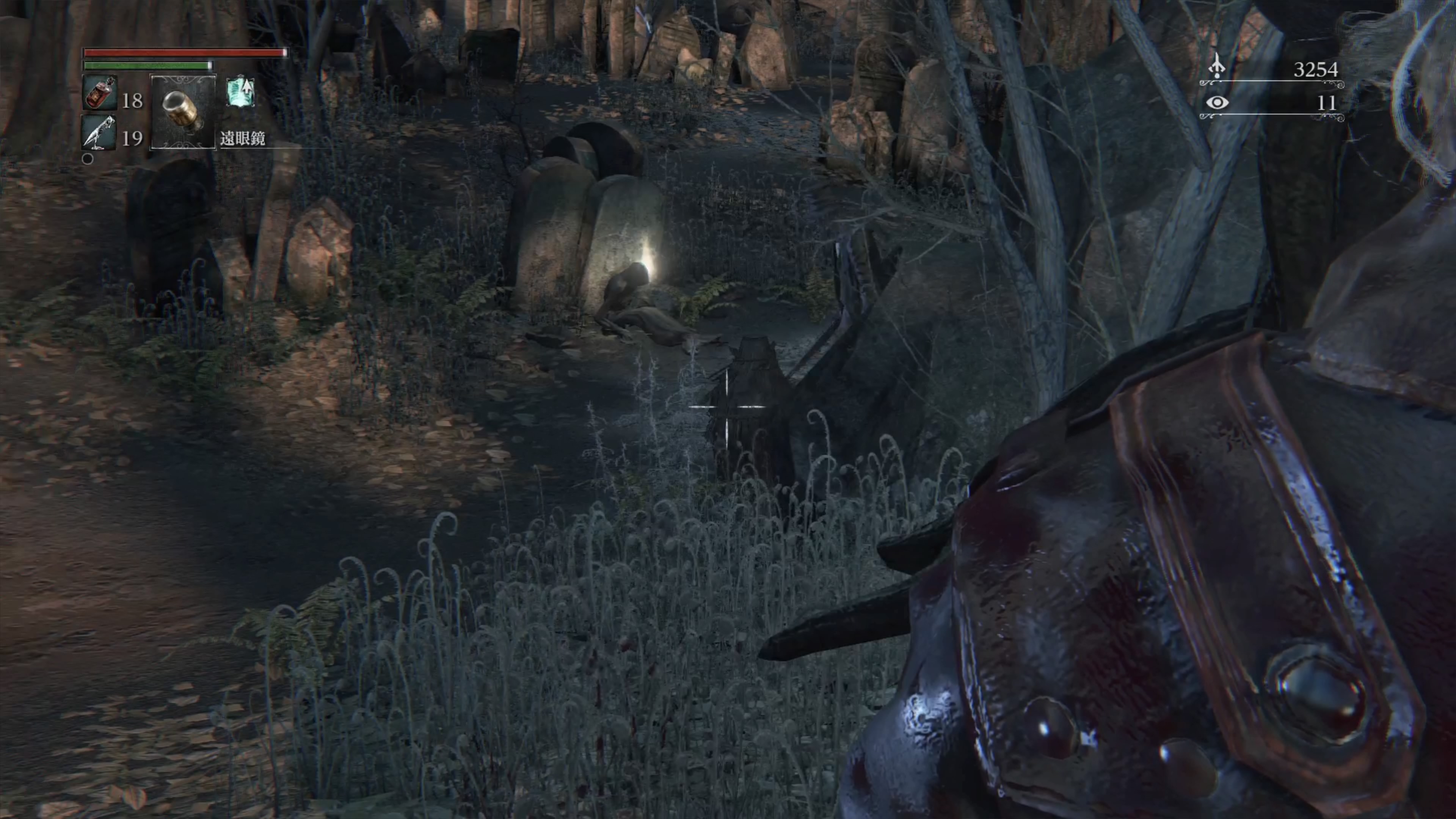 - 出口付近には更に1体の猟銃と2体の狩猟犬が居り、更に奥まで行くとドアがあり、その先がヘムウィックの墓地街である。まずは正面の灯りを点灯しよう。