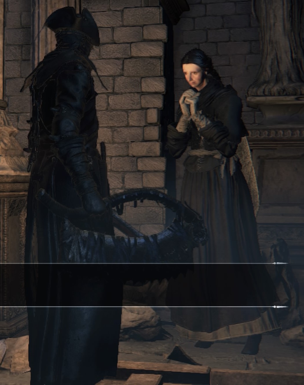 ヤーナム市街に佇むペストマスクが印象的な女狩人。話しかけると後輩であるプレイヤーにアイテムとジェスチャーをくれる