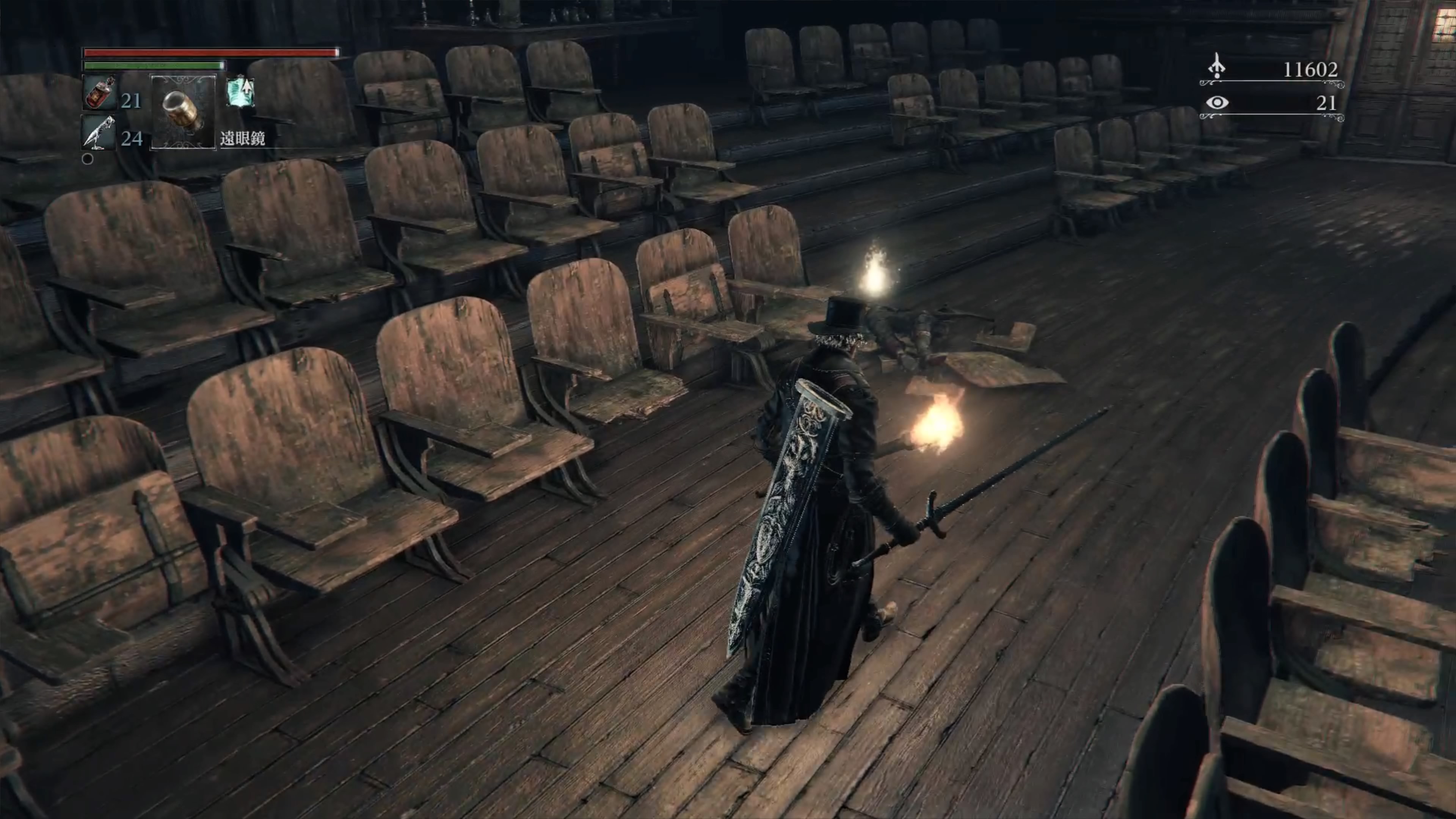 - 一気に突っ込まず井戸の手前辺りでトニトルスの狩人だけを引き付け、その後に銃槍の狩人、とすると良い。さもなくば結構強いエネミー狩人相手に2対1である。