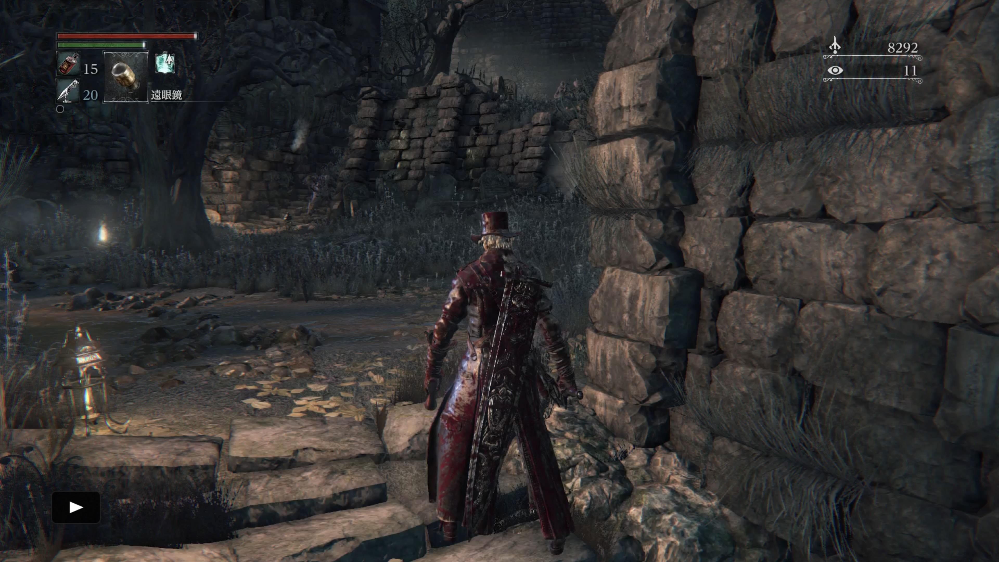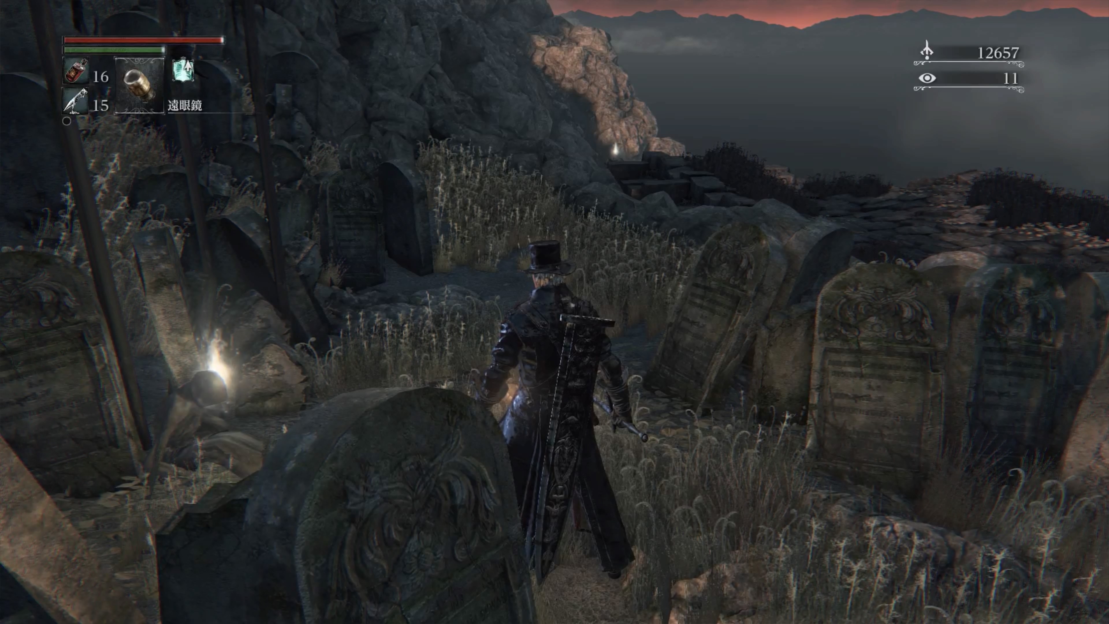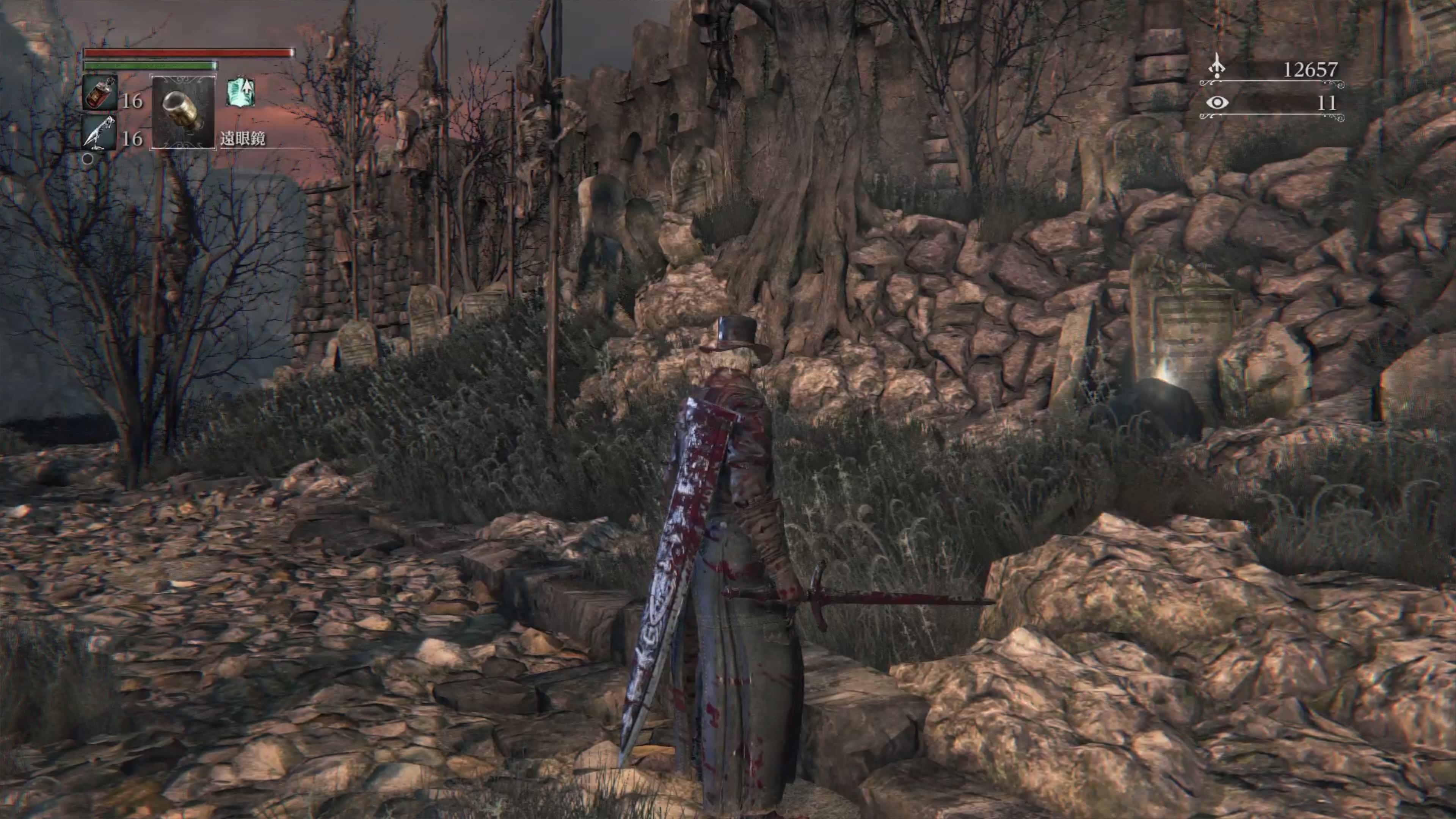 - 出口付近には更に1体の猟銃と2体の狩猟犬が居り、更に奥まで行くとドアがあり、その先がヘムウィックの墓地街である。まずは正面の灯りを点灯しよう。