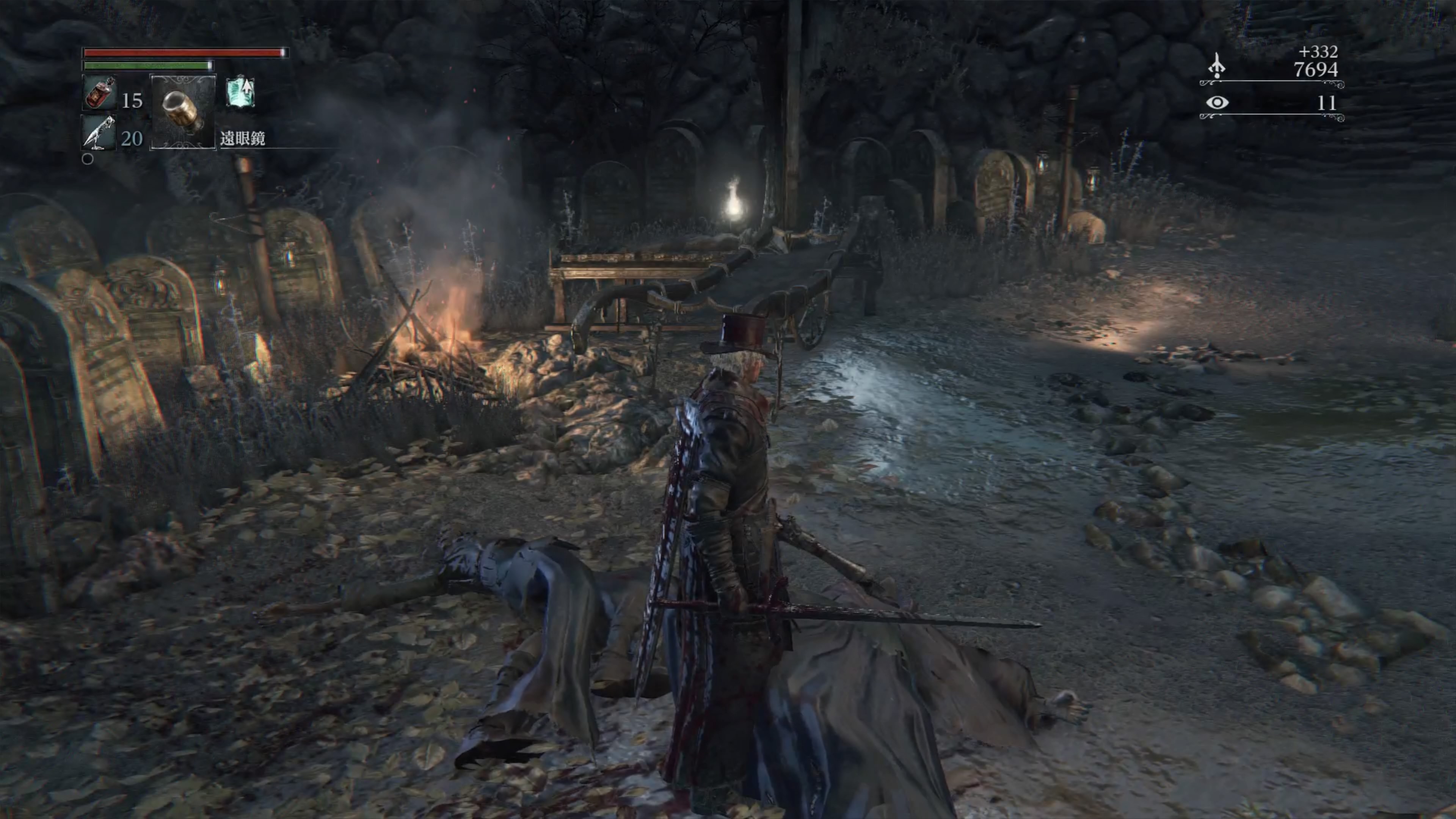 - 奥には墓女3体が待ち構えている。1体は距離が離れていると火炎瓶を投げて来るので位置取りに注意。