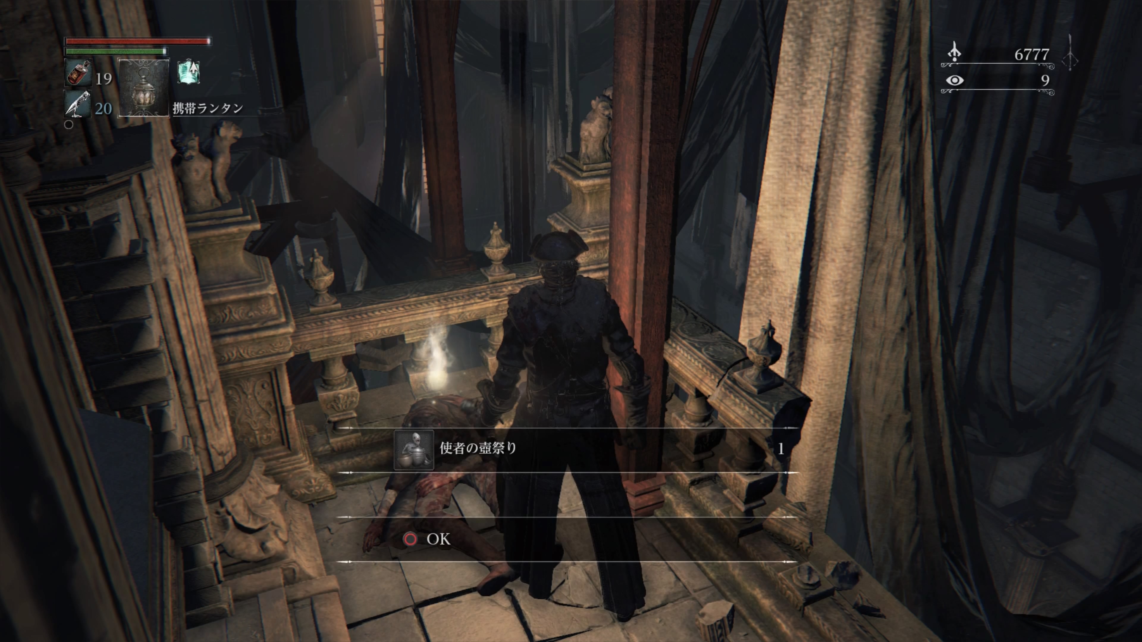 - ベランダを回って行くと梯子があるのでそれを更に上って行くと、最上階の屋内に宝箱を発見できる。宝箱からは優秀なルドウイークの聖剣が購入可能になる「輝く剣の狩人証」を入手できる。