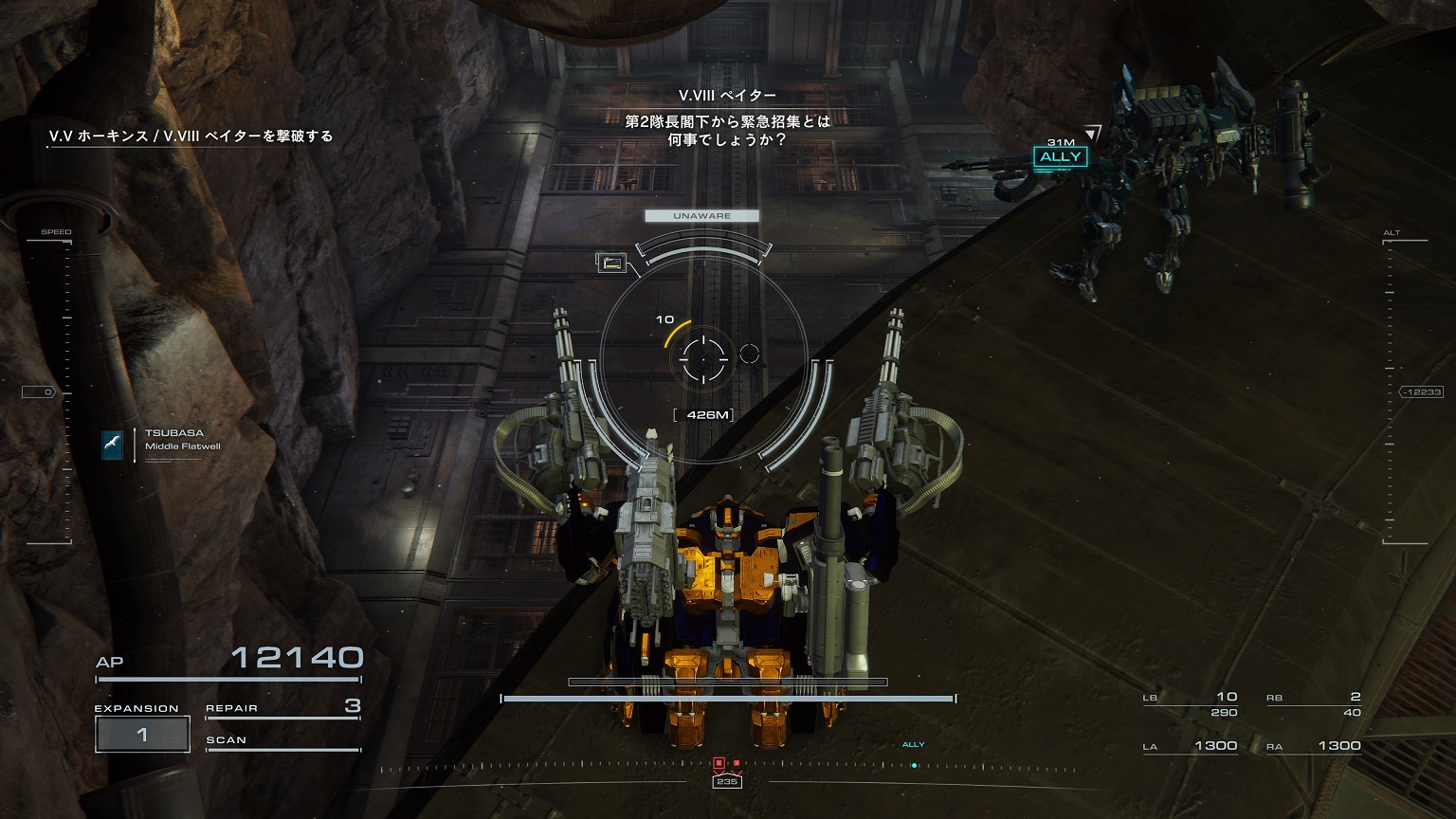 - 4機の無人ACを引き連れたボスACとまず1戦。まだ真っ当なAC戦。前座だけにリペアは使わない。