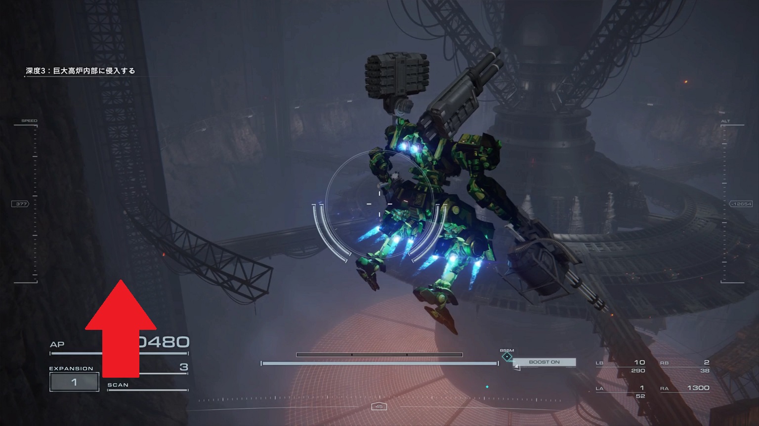 - お供のAC達は無視して構わない。お供の攻撃は甘く、中量級以下の高速機なら動き続けていれば躱せる。ボスACを速攻してしまいたい。