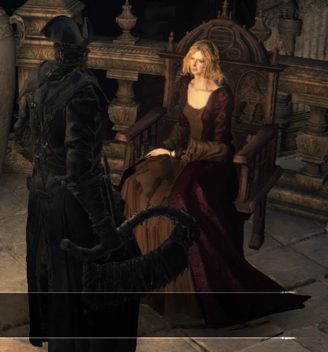 ヤーナム市街に佇むペストマスクが印象的な女狩人。話しかけると後輩であるプレイヤーにアイテムとジェスチャーをくれる