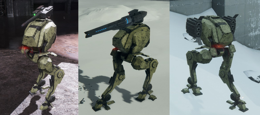 武装は連装マシンガンと胴体左右に内蔵されたミサイルが共通、バリエーションとして左からデトネートキャノン、垂直ミサイル、グレネードキャノンが存在。