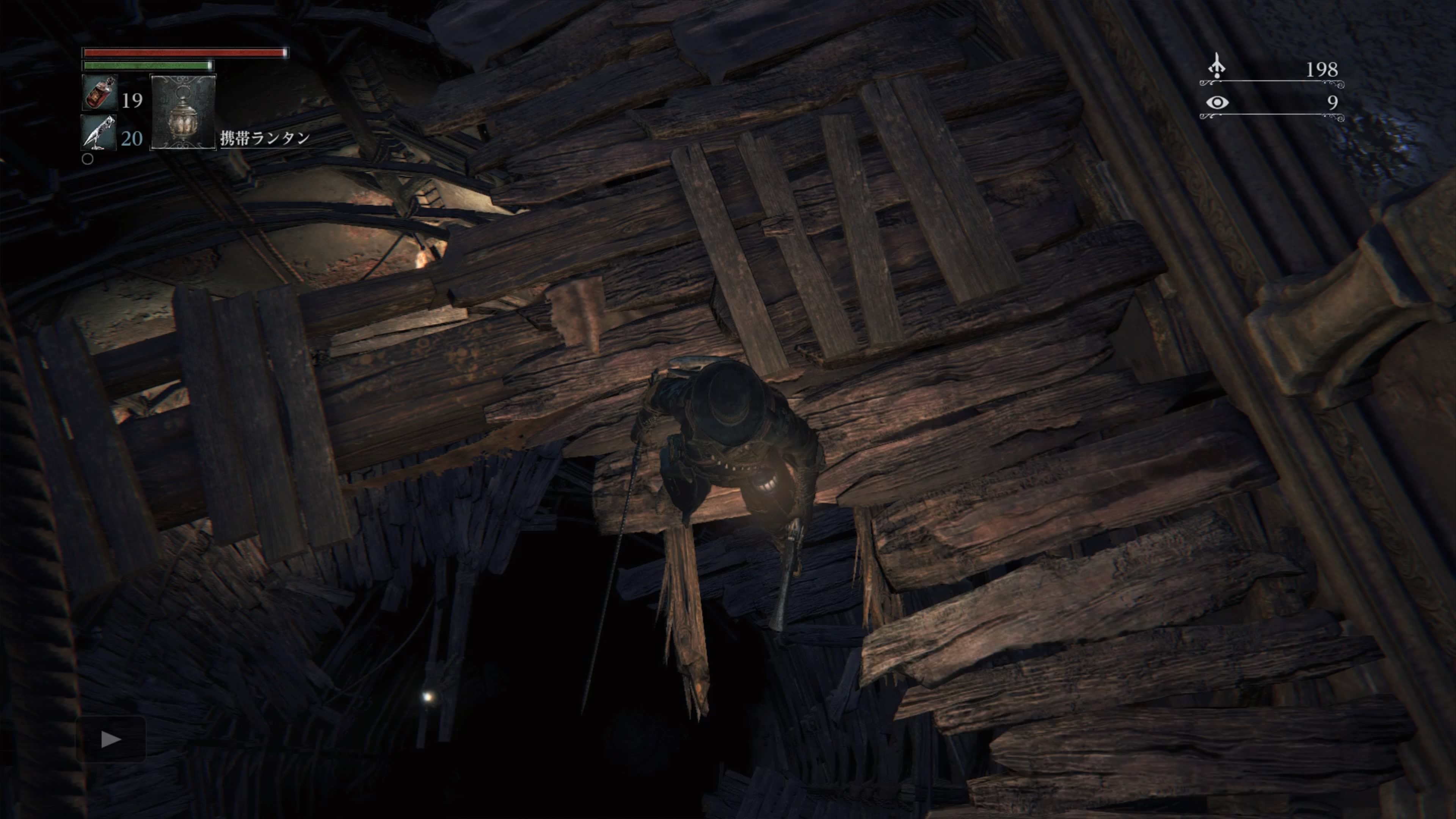 - 医療教会の工房内部に入ったら左手から飛び降り、そこから小さい足場に飛び降り、更にもう一度すぐ下に降りる事でドアの前に着地できる。