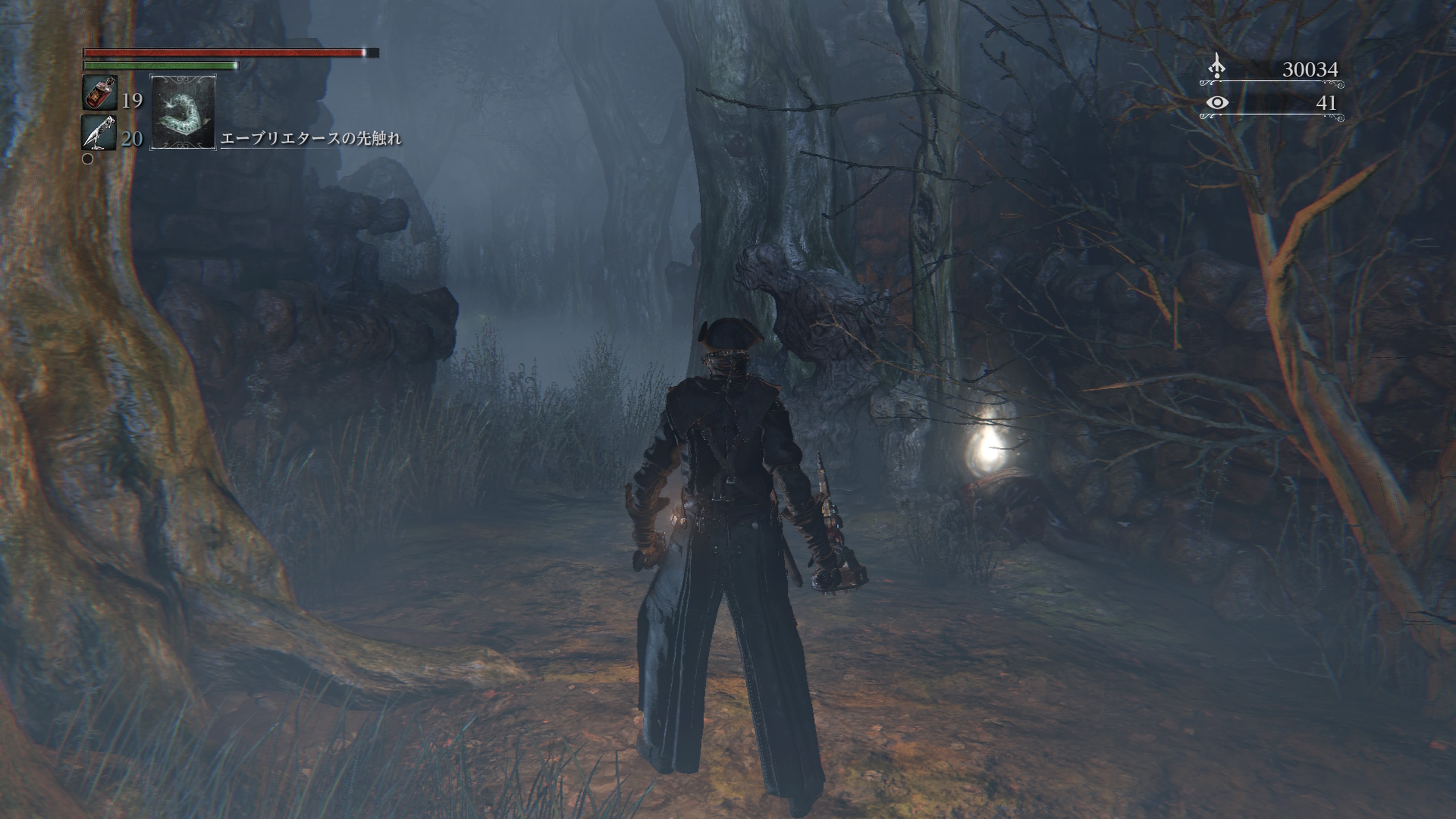- この辺りをうろついている虫人間のようなエネミー「瞳の苗床」の組み付き攻撃を受けると発狂ゲージが溜まる。
