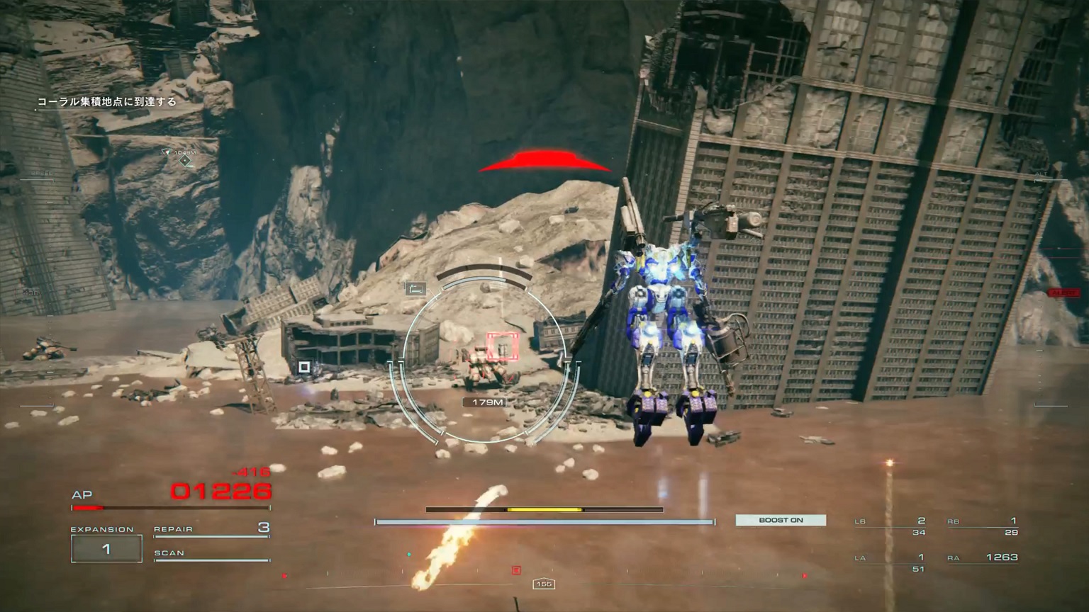 - 4機の無人ACを引き連れたボスACとまず1戦。まだ真っ当なAC戦。前座だけにリペアは使わない。
