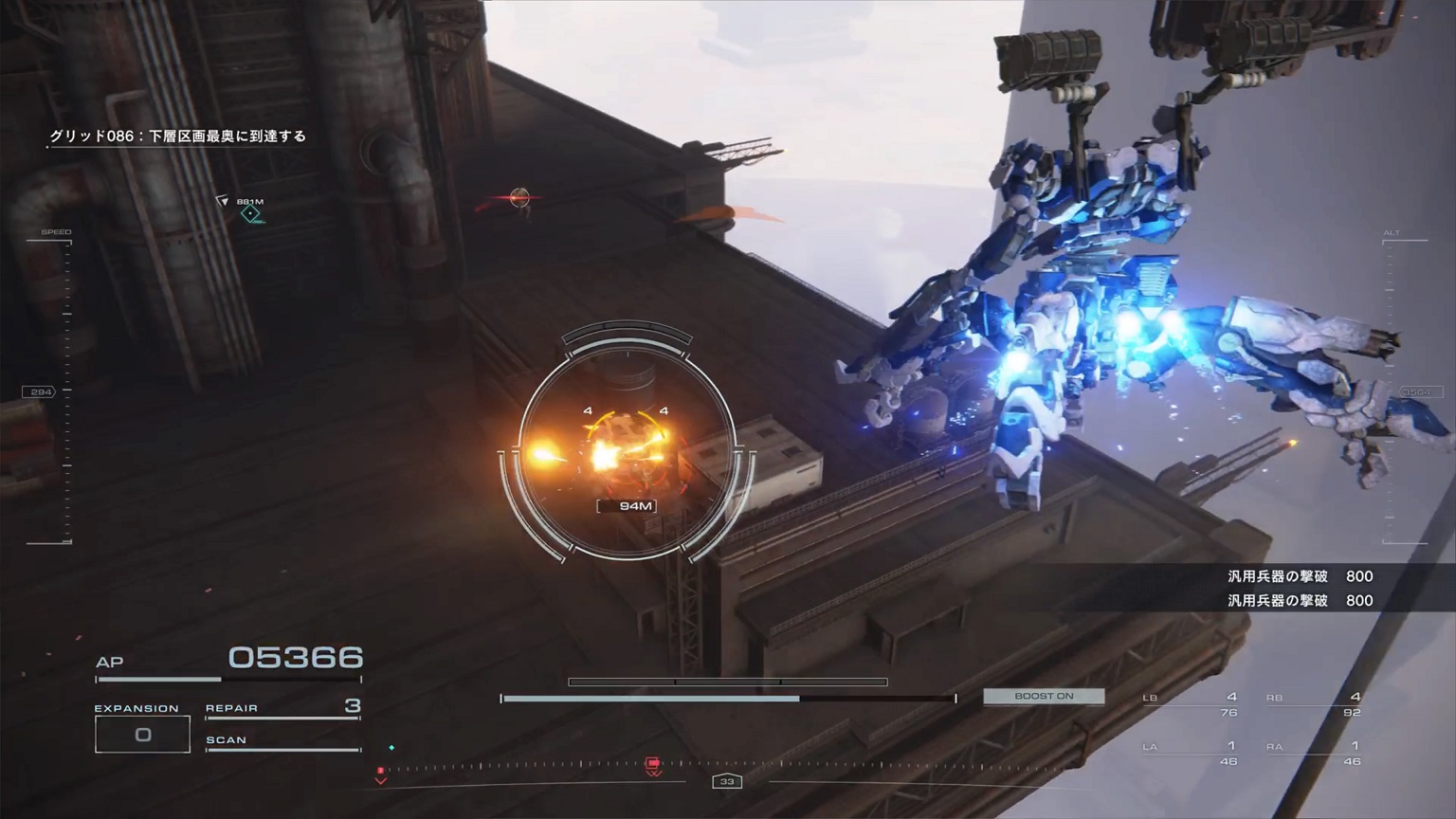 - 4機の無人ACを引き連れたボスACとまず1戦。まだ真っ当なAC戦。前座だけにリペアは使わない。