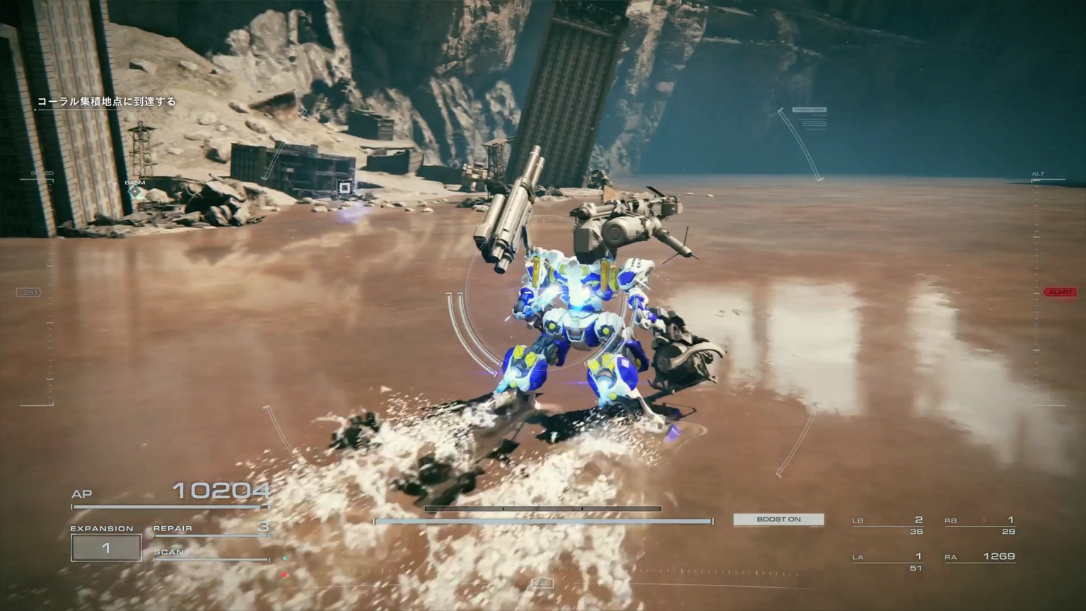 - 4機の無人ACを引き連れたボスACとまず1戦。まだ真っ当なAC戦。前座だけにリペアは使わない。