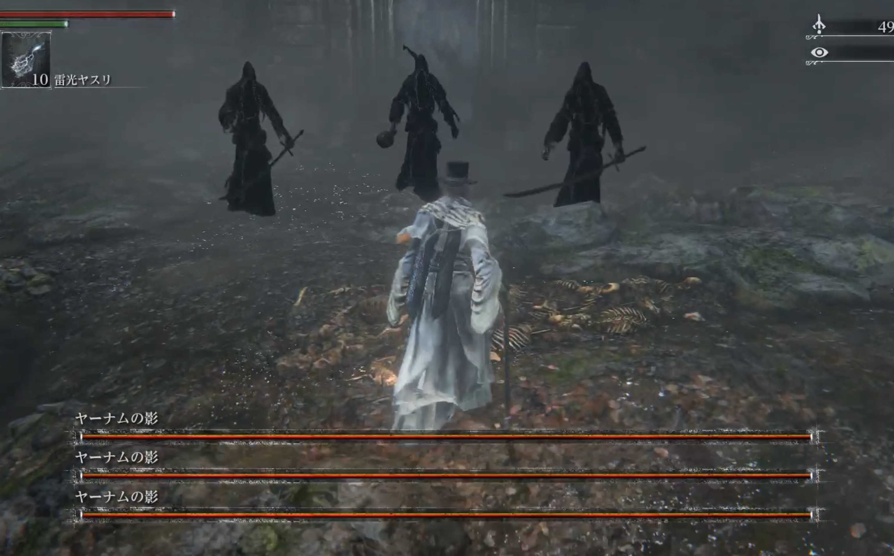 今回は先の格闘、先触れに加えて彼方への呼びかけを使用する。ビルゲンワース、ヨセフカの診療所でも見た事があるかもしれないが、バックステップで避けようとすると意外な程食いつかれて被弾し大ダメージを喰らうアレである。今回は遮蔽物が全く無いのでステップで避けるしかない。